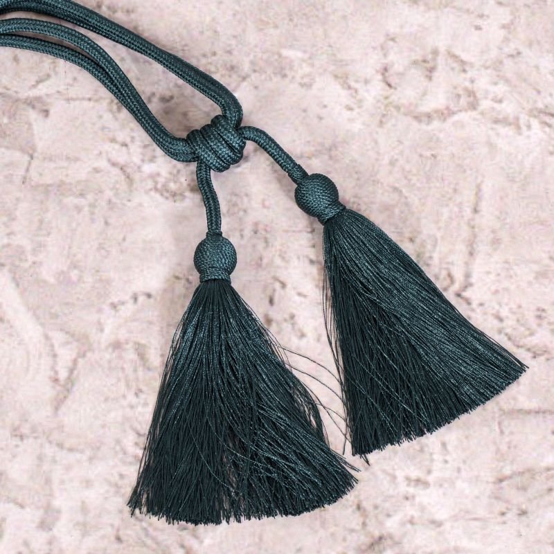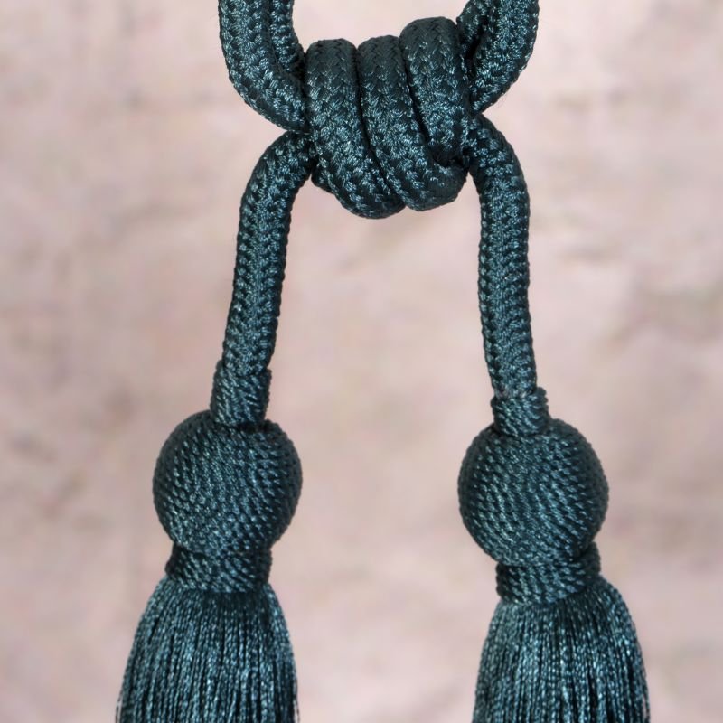 KLASYCZNE PODPIĘCIE DEKORACYJNE DO ZASŁON WYKOŃCZONE CHWOSTAMI. SZNUR Z CHWOSTAMI ŁĄCZĄ KULKI OPLECIONE GRUBYM A'LA ŁAŃCUSZKIEM Z SATYNOWEJ NITKI.