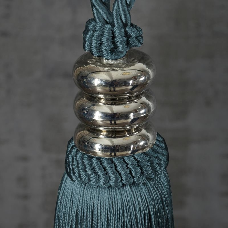 ELEGANCKIE PODPIĘCIE DEKORACYJNE DO ZASŁON WYKOŃCZONY DUŻYM CHWOSTEM Z MODERNISTYCZNĄ, SREBRNĄ OZDOBĄ. CHROMOWANE OBRĄCZKI ZDOBIĄ GŁÓWKĘ CHWOSTA - PIĘKNIE ODBIJAJĄ ŚWIATŁO. CHWOST DOSKONALE ODBIJE SIĘ NA TKANINIE ZASŁONOWEJ.