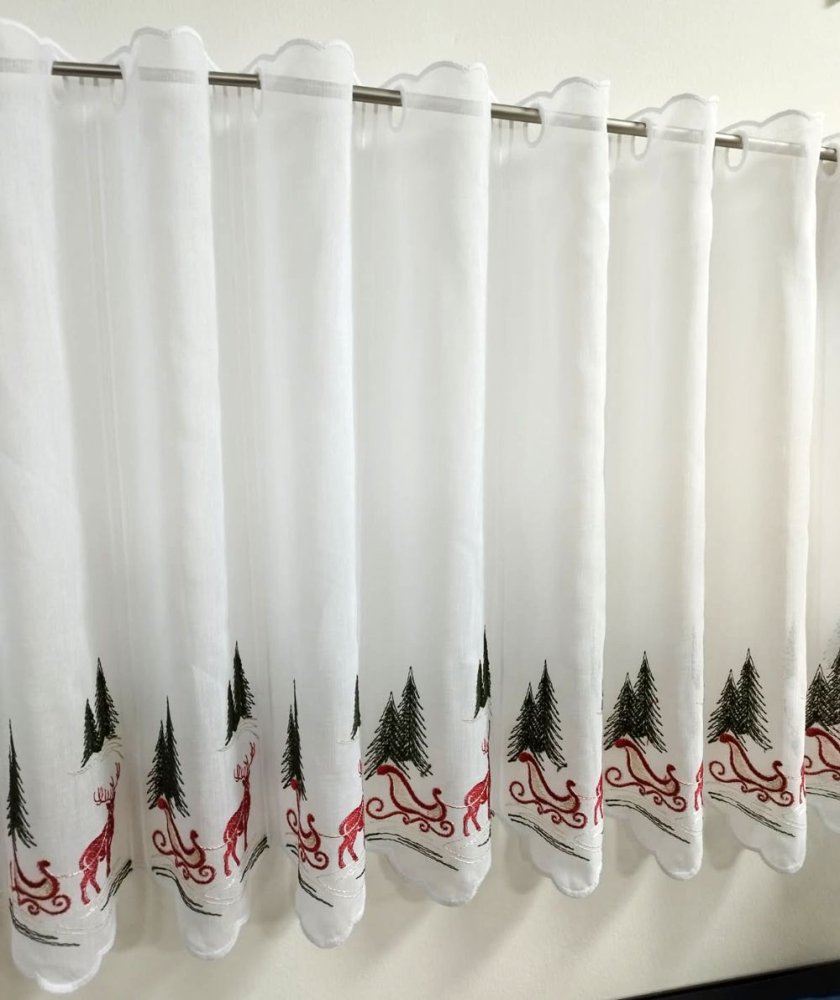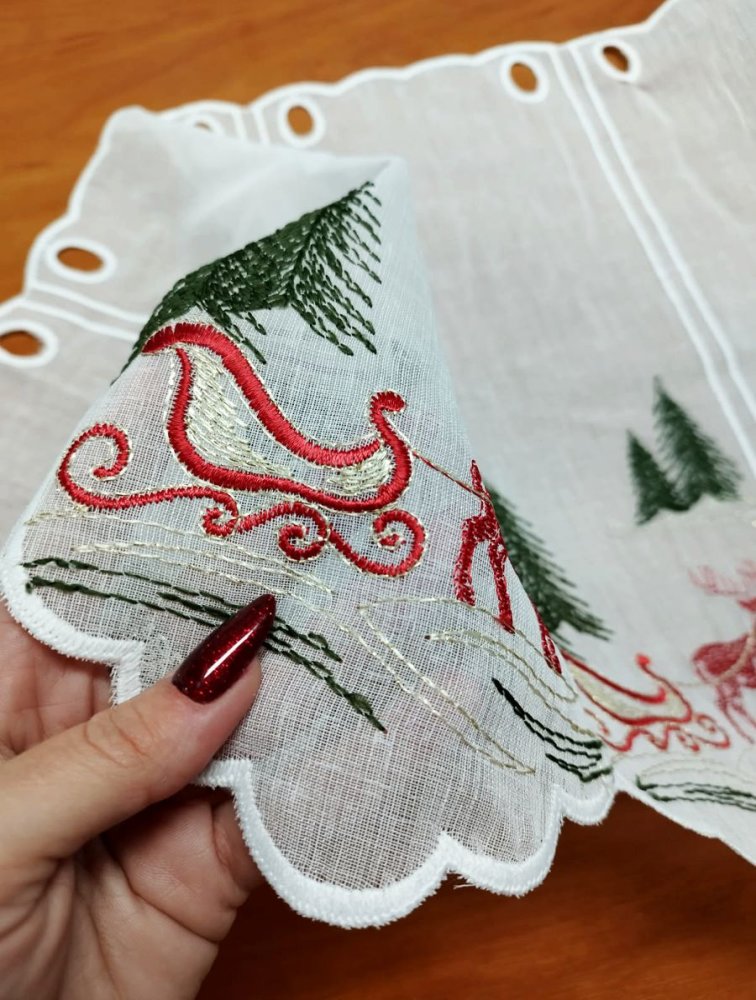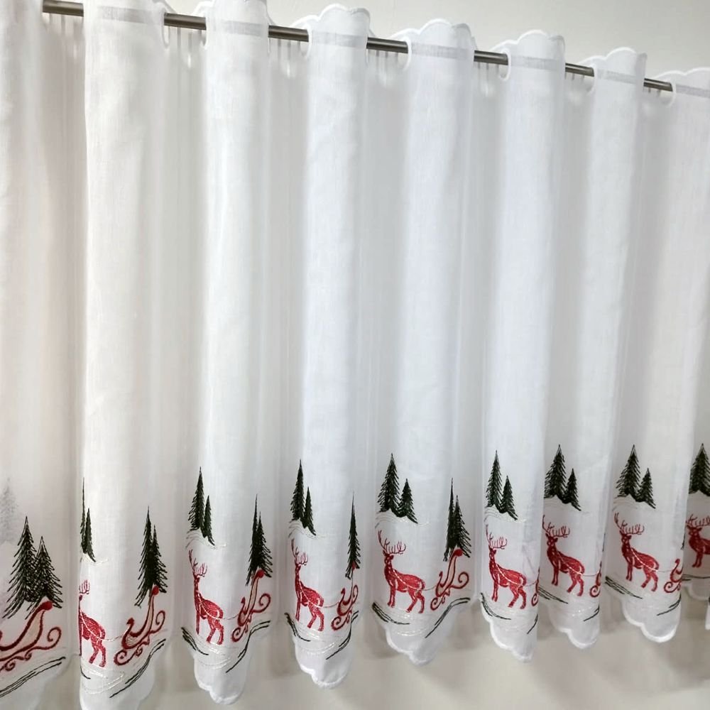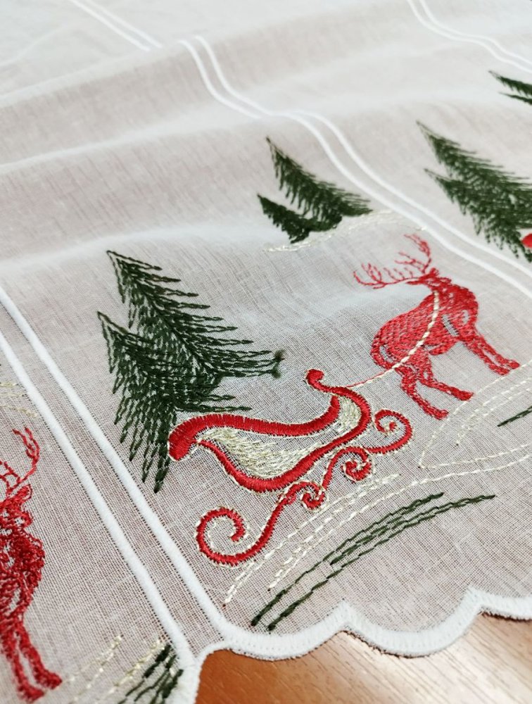 Wprowadź do swojego domu magię świąt dzięki wyjątkowej zazdrostce bożonarodzeniowej wykonanej z lekkiej, białej etaminy. Elegancki haft przedstawiający renifery ciągnące sanie w otoczeniu świerków, zdobiony czerwienią, zielenią i złotem, tworzy niezwykle przytulny świąteczny klimat.