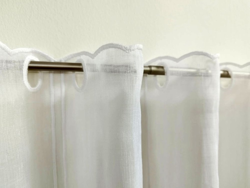 Zazdrostka ma panelowy układ (panel 16 cm), dzięki czemu łatwo dopasujesz jej szerokość do każdego okna. Góra wykończona haftowanymi oczkami, a dół subtelnymi łuczkami. Dostępna w dwóch wysokościach: 40 cm i 60 cm – idealna zarówno na górę, jak i dolną kwaterę okna.