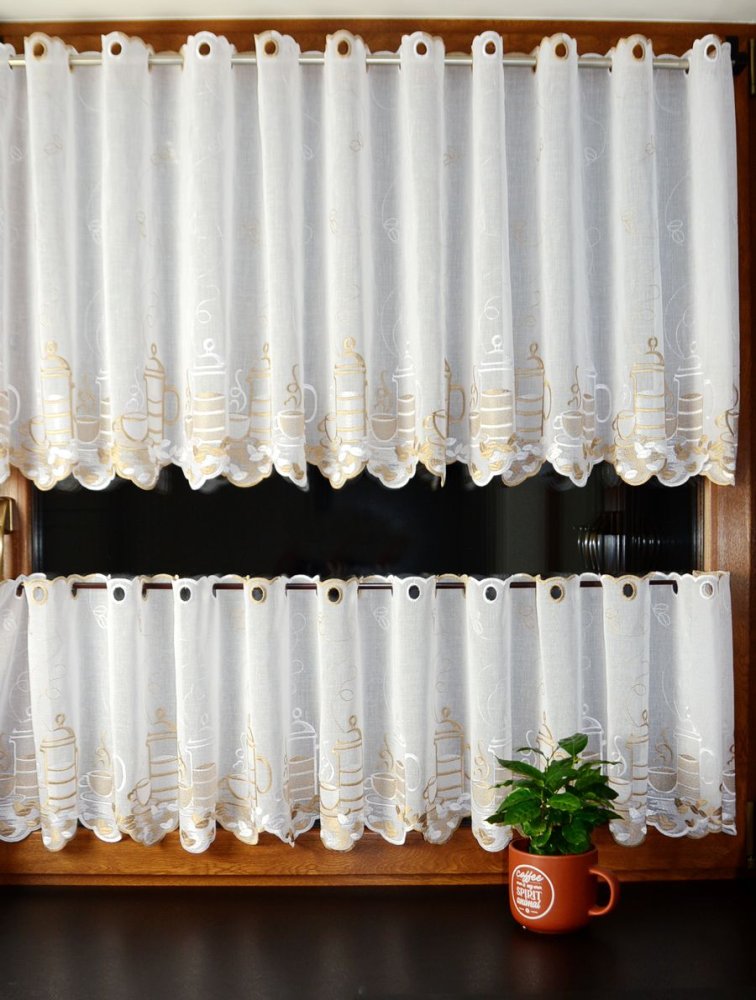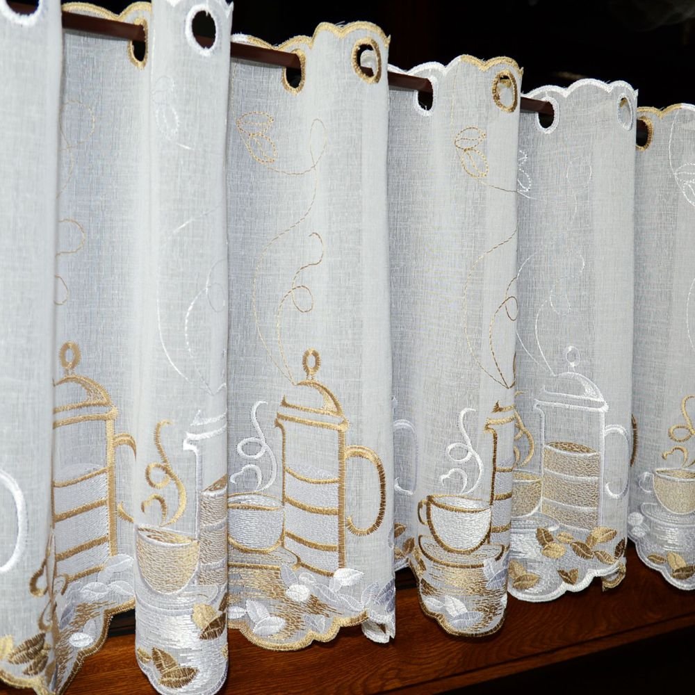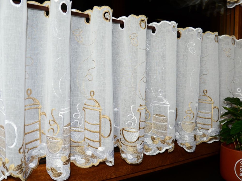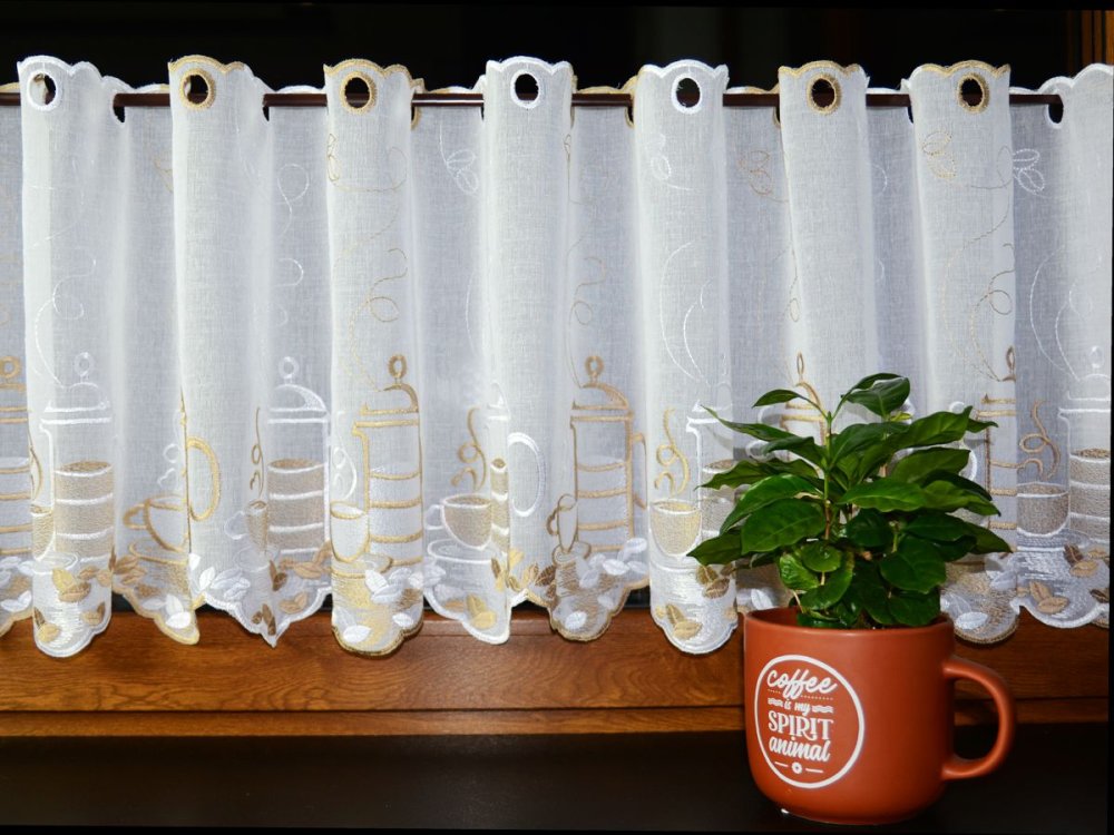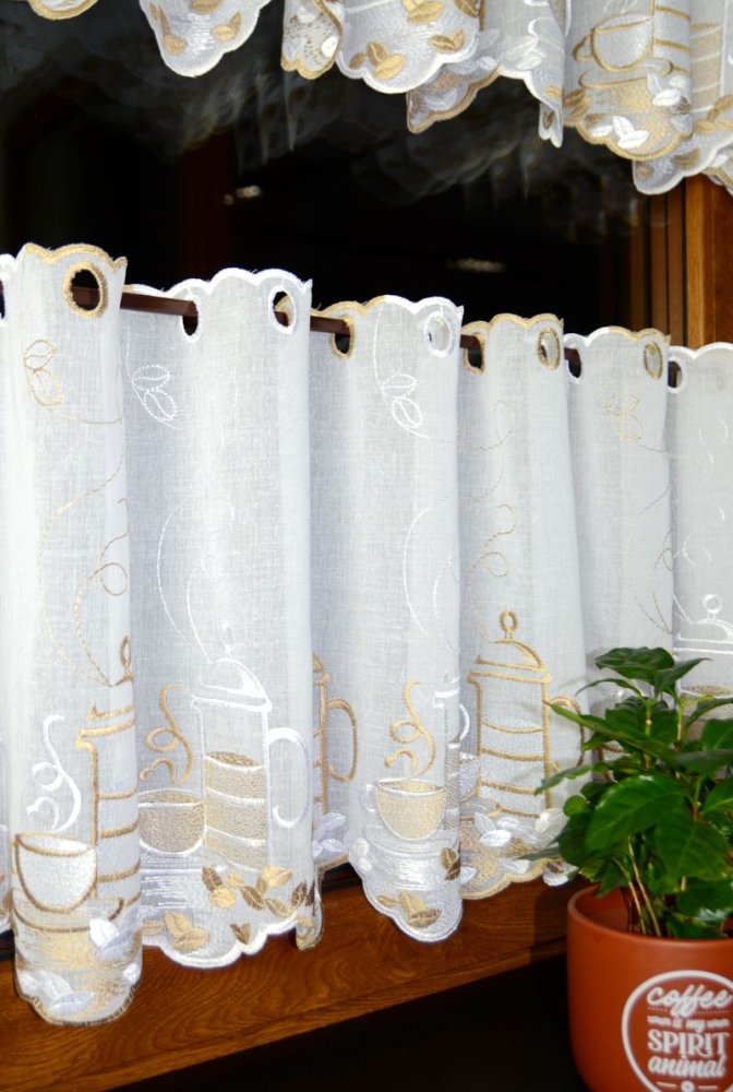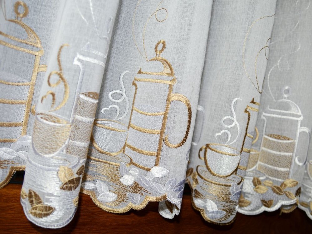 Zazdrostki „CAFFEE” pochodzą z tureckiej produkcji, znanej z wysokiej jakości tkanin firanowych i perfekcyjnego haftu. Haft jest wyraźny, trwały i widoczny po obu stronach – zarówno od wewnątrz kuchni, jak i od zewnątrz budynku.