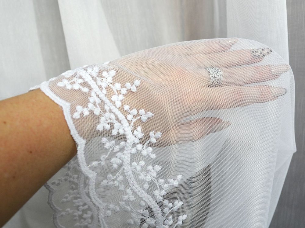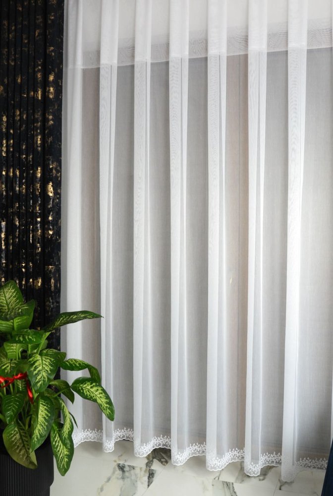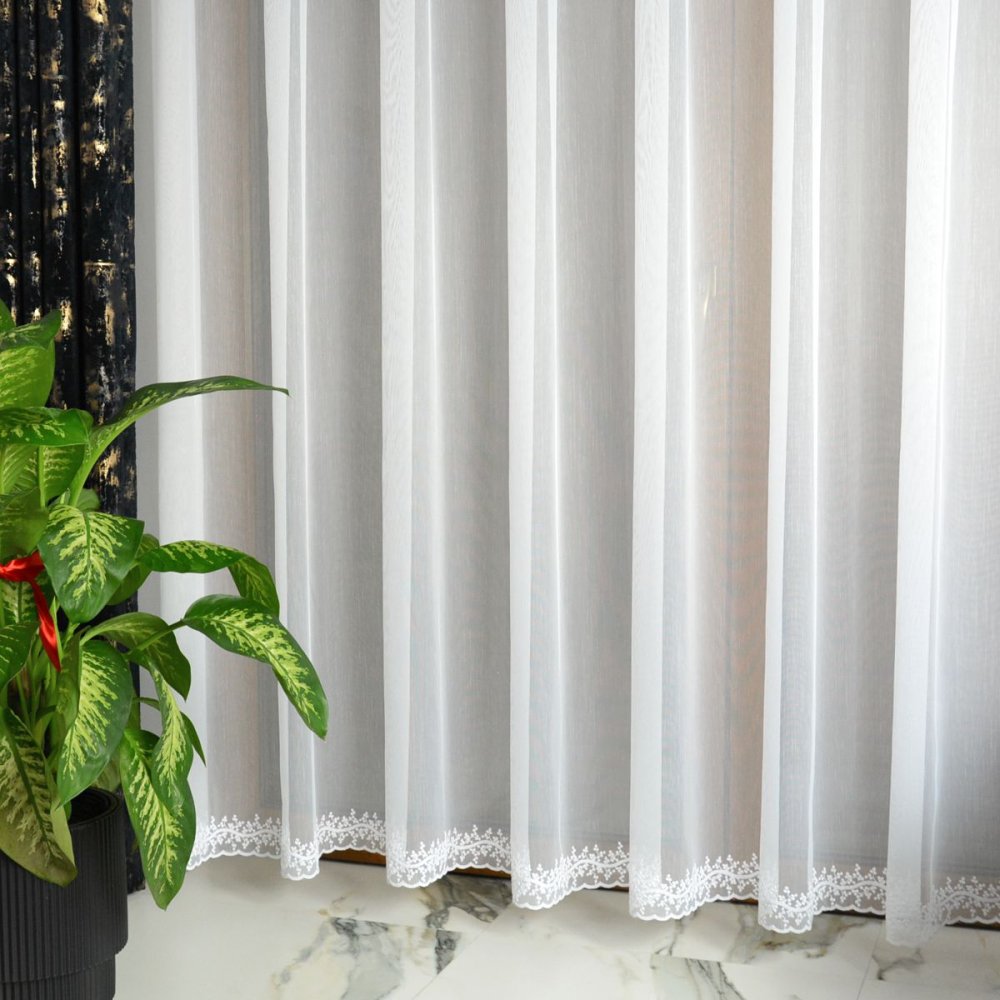 Firana SELIA 300 cm to propozycja dla osób, które cenią czystość formy i dyskretne detale zamiast rozbudowanych zdobień. Wykonana na markizecie typu ADEN (bambusowej), posiada półtransparentną strukturę o równomiernym splocie, który miękko filtruje światło i nie ogranicza widoczności wnętrza. Dolna linia firany została podkreślona wąskim haftowanym szlaczkiem z motywem kwiatowym, tworząc elegancką ramę wizualną bez efektu ciężkości.