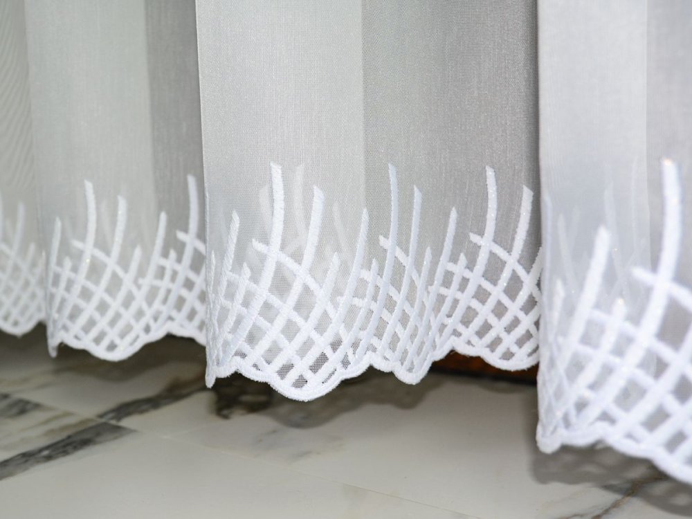 Model SENZA dobrze sprawdza się również jako firana zakładana. W takiej konfiguracji tkaninę obraca się tak, aby haft stanowił wewnętrzne, eleganckie wykończenie. Przy tej metodzie zaleca się docinanie materiału według schematu: