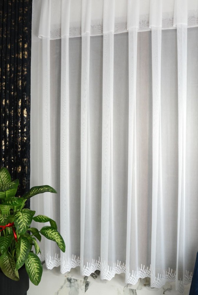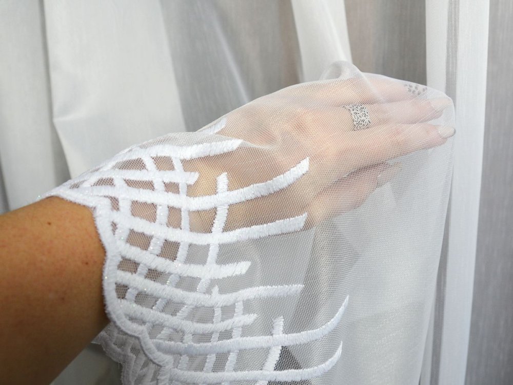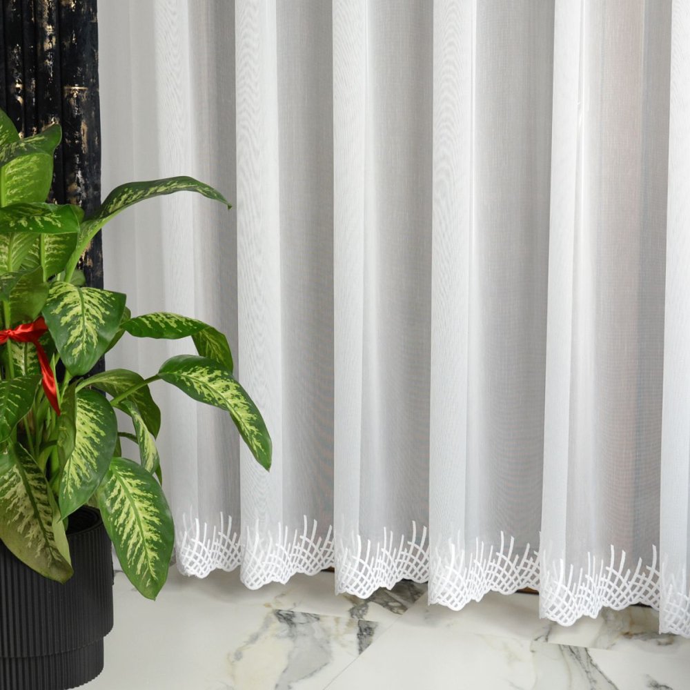 Firana SENZA to model zaprojektowany z myślą o nowoczesnych aranżacjach, w których dominują gładkie powierzchnie i subtelne detale. Wykonana na markizecie typu ADEN (bambusowej), charakteryzuje się równomiernym, półtransparentnym splotem, który skutecznie rozprasza światło, nie ograniczając jego dopływu do wnętrza. Dolna część firany została wykończona geometryczną, współczesną formą haftu, która pełni funkcję delikatnej ramy wizualnej zamiast klasycznej dekoracji.