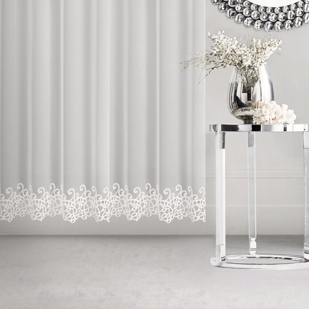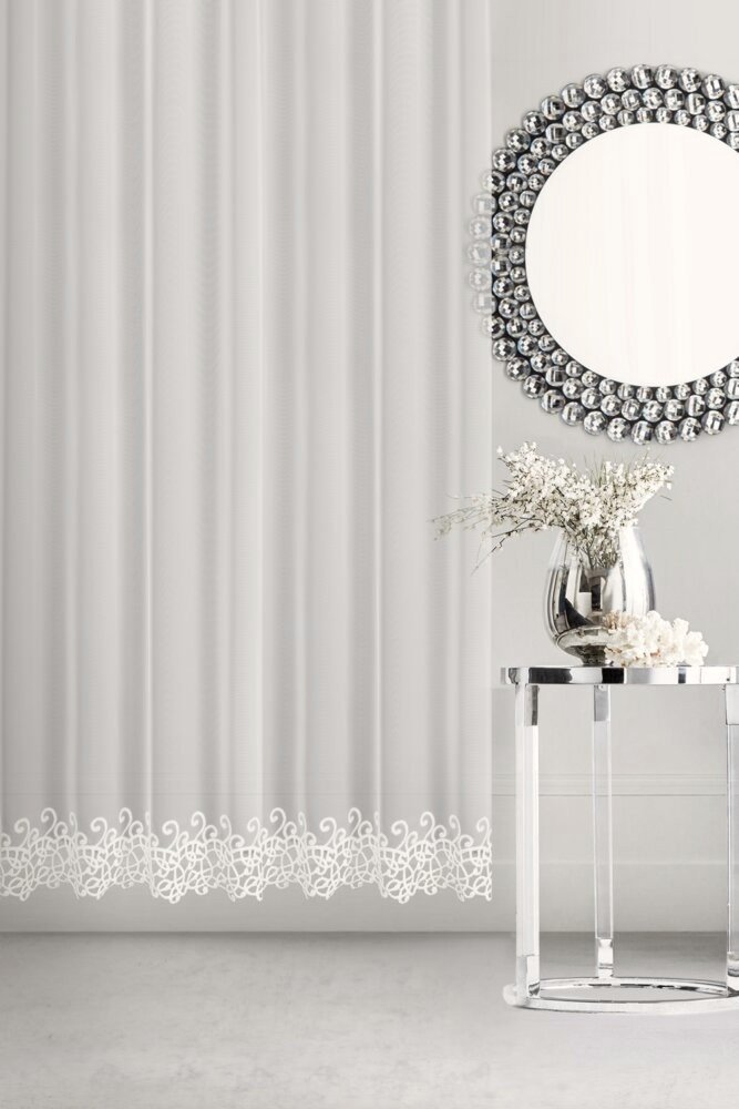 Dół firany tworzy efektowną, ozdobną linię, nadając wnętrzu lekkości i elegancji w stylu glamour. SCILLA doskonale prezentuje się zarówno jako samodzielna dekoracja, jak i w zestawieniu z zasłonami – szczególnie tymi z miękkiego, połyskującego welwetu.