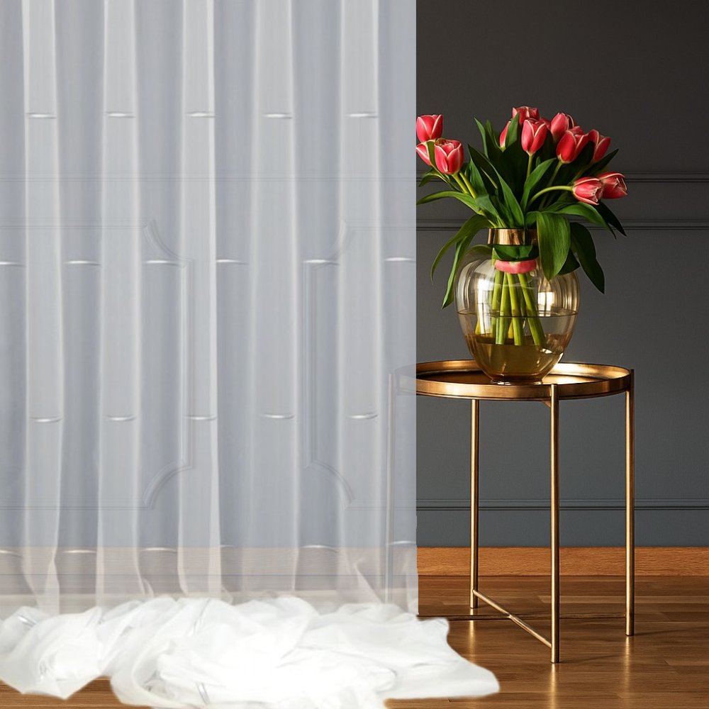 Tkanina z woalu idealnie nadaje się na firany, rolety rzymskie, panele czy ekrany okienne, tworząc harmonijną, nowoczesną kompozycję dekoracyjną. Dostępna na metry lub szyta na wymiar, pozwala dopasować rozmiar do każdego okna i przestrzeni.