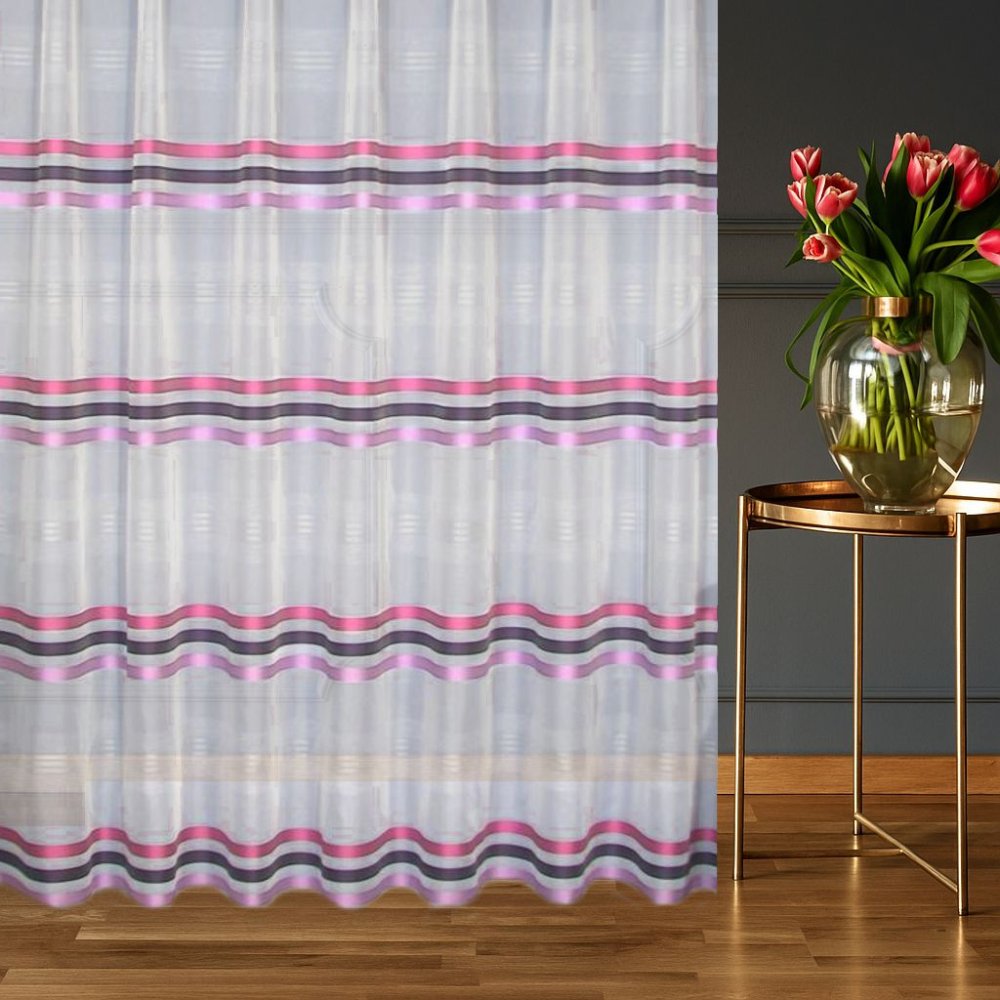 Delikatne, tkane pasy w odcieniach fioletu i różu nadają tkaninie wyjątkowego charakteru – wprowadzają do wnętrza harmonię, świeżość i nutę nowoczesności. To firana, która doskonale komponuje się zarówno z jasnymi, jak i ciemniejszymi dodatkami, tworząc efektowną i stylową oprawę okna.