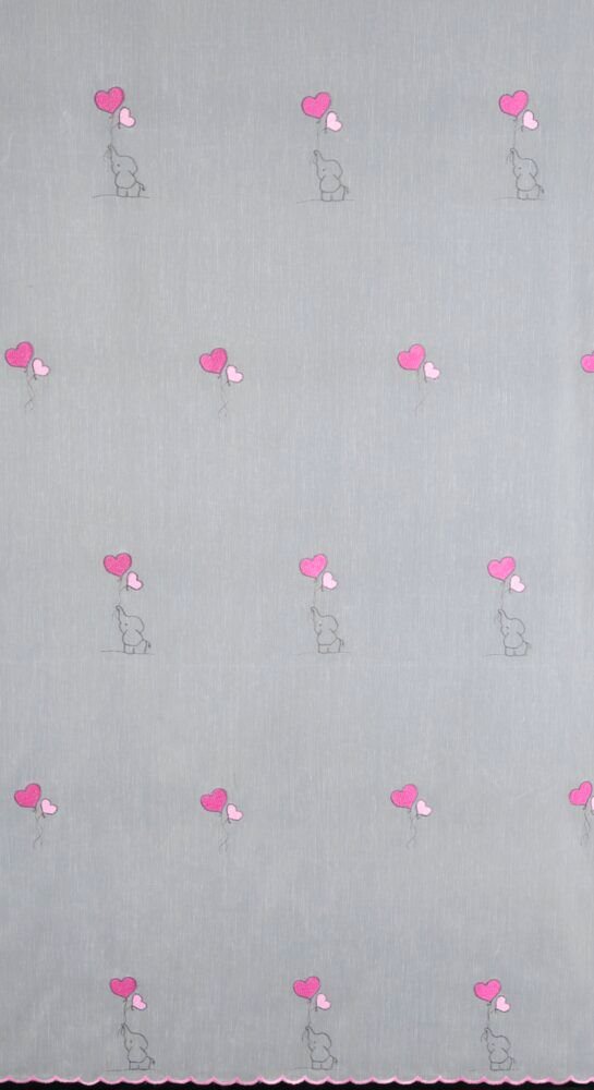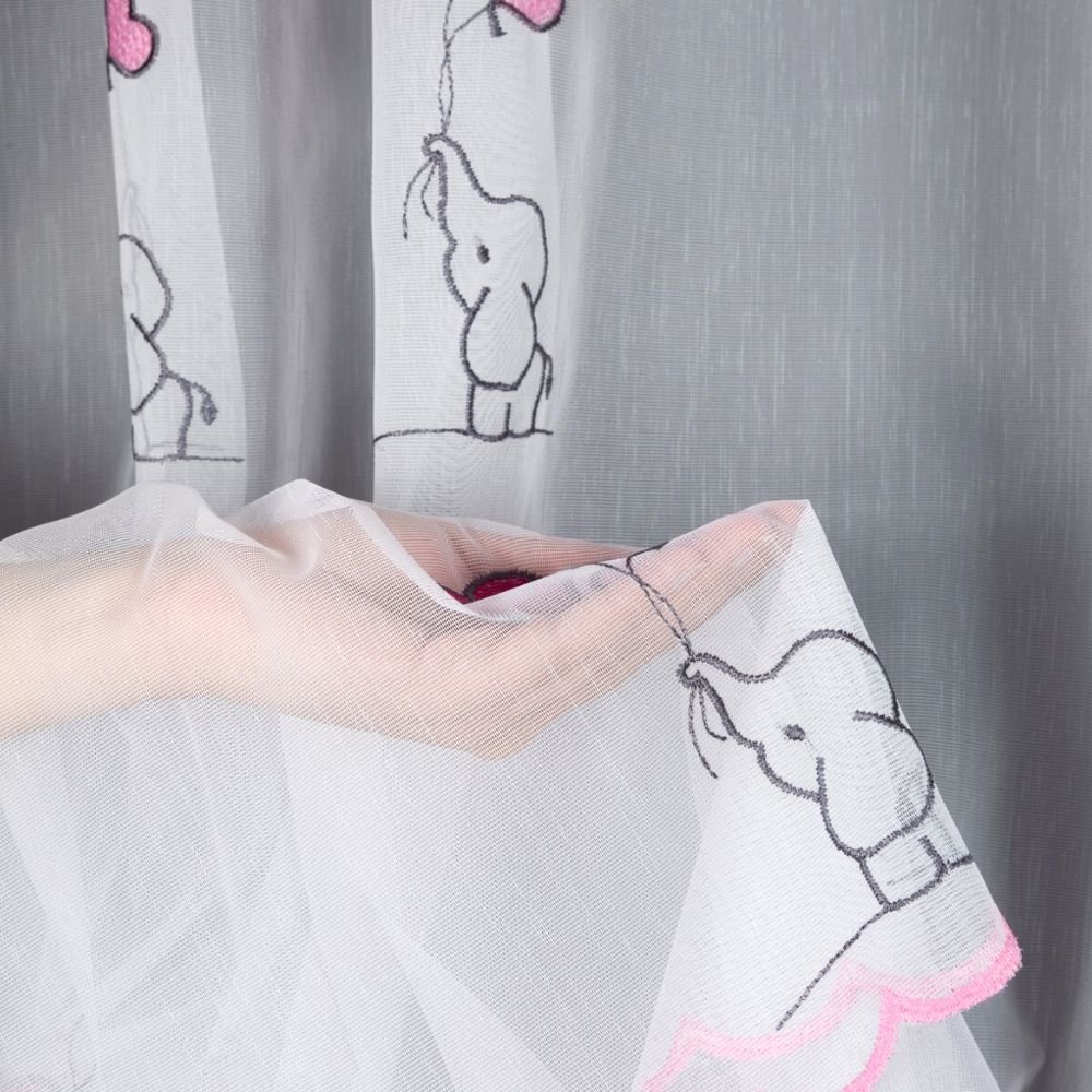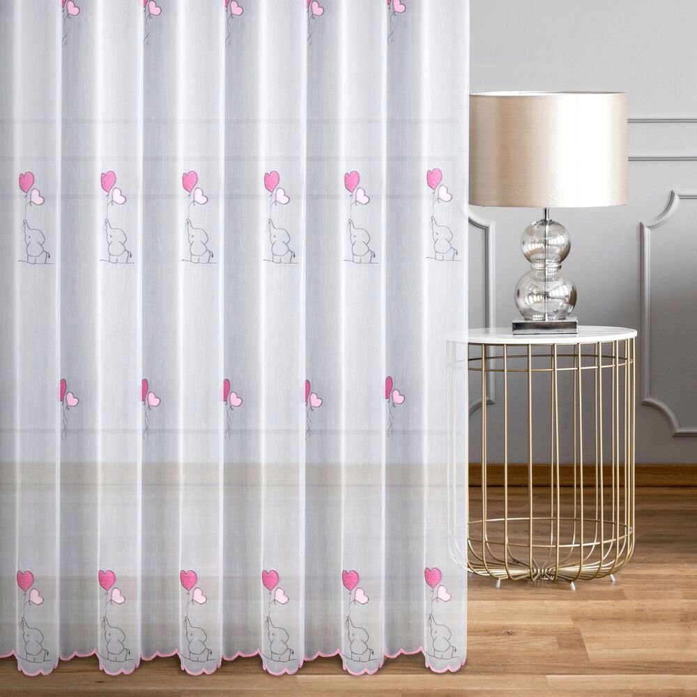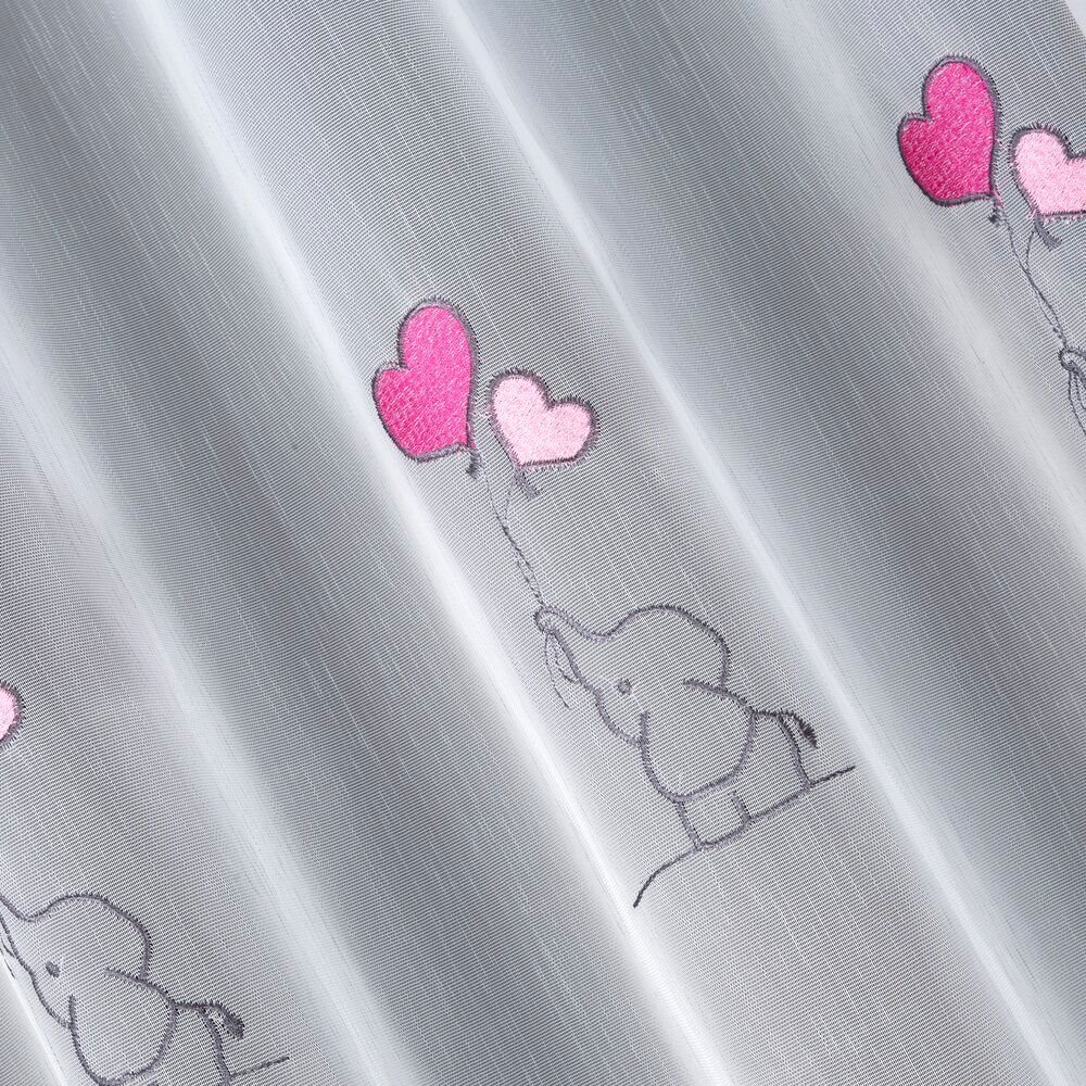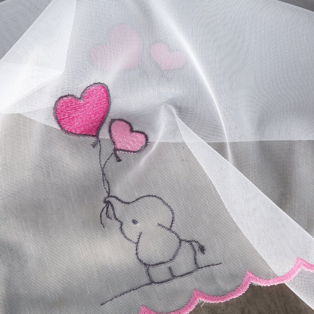 Długa firana dziecięca o wysokości 300 cm to urocza i jednocześnie praktyczna dekoracja okienna zaprojektowana z myślą o pokoju dziewczynki. Model wyróżnia się haftowanymi słonikami oraz serduszkami w odcieniach różu i jasnej szarości, które rozmieszczone są na całej powierzchni tkaniny. Delikatny motyw dziecięcy tworzy przyjazną, ciepłą atmosferę i nie przytłacza wnętrza.