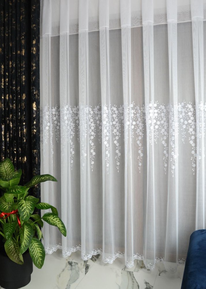 Łączna wysokość zdobienia haftem sięga około 147 cm, co tworzy wyraźną, ale lekką dekorację w dolnej części firany.