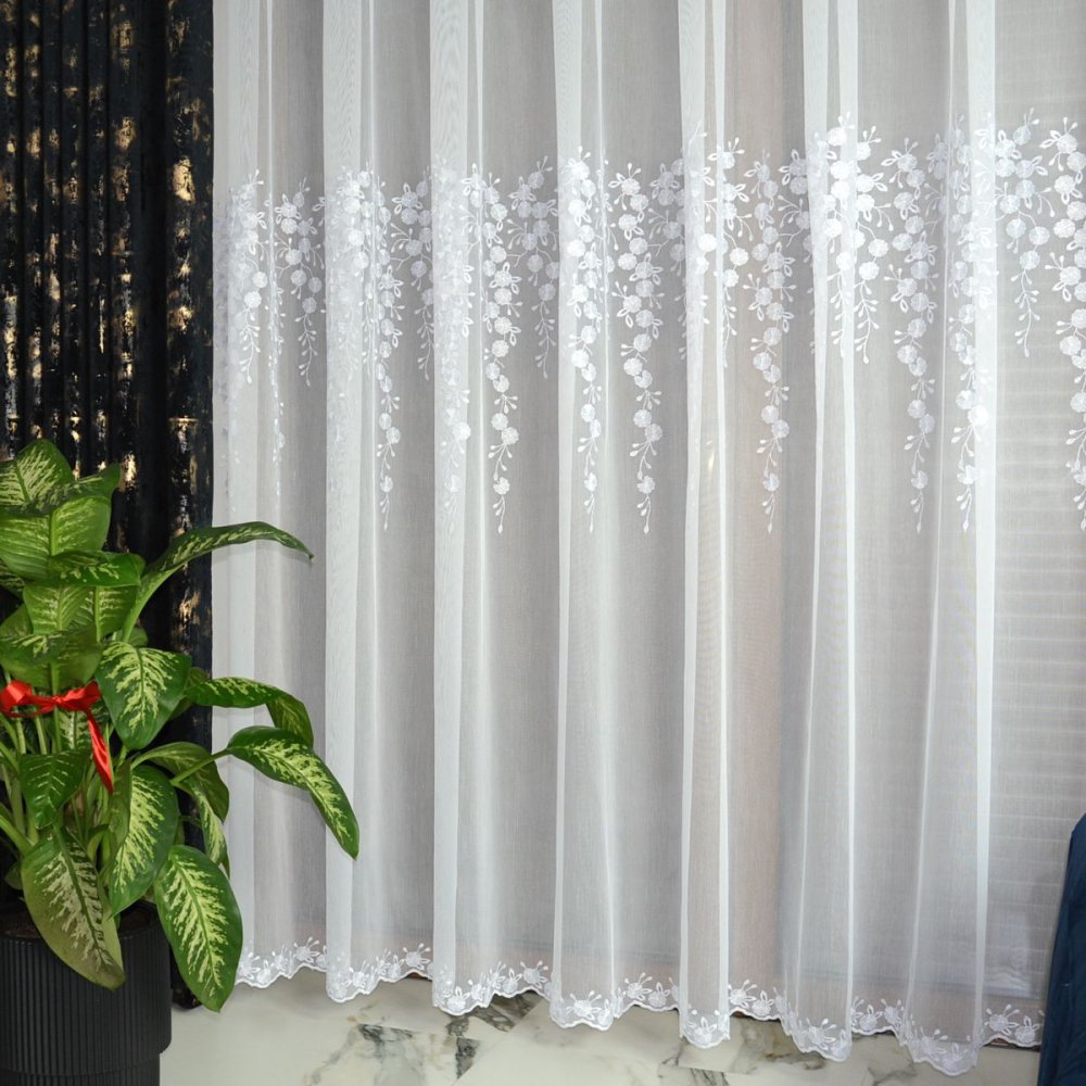 Firana ADELIN to wyjątkowo subtelna i elegancka dekoracja okna wykonana na wysokiej jakości markizecie typu ADEN, nazywanej również markizetą bambusową. Delikatna struktura materiału przypominająca naturalny „deszczyk” sprawia, że tkanina pięknie układa się w oknie i doskonale przepuszcza światło. Bogaty haft z motywem kwiatów oraz opadających gałązek nadaje firanie lekkości i ponadczasowej klasy, dzięki czemu idealnie pasuje do salonów i reprezentacyjnych wnętrz.