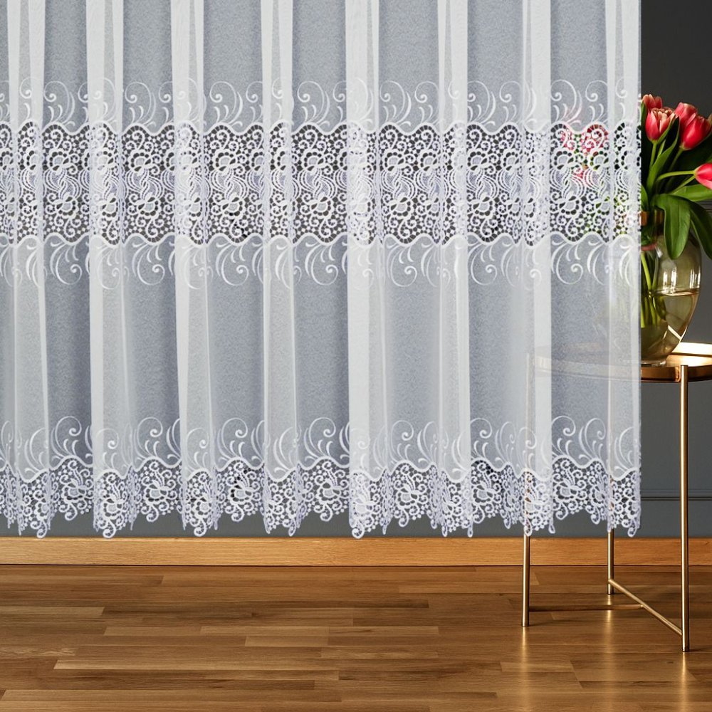 Dostępność różnych wysokości – oprócz wersji 1,80 m dostępna także białą firana z gipiurą „Margarita” 2,80 m — idealna na firany krótkie oraz komplet firan do okna i drzwi balkonowych.