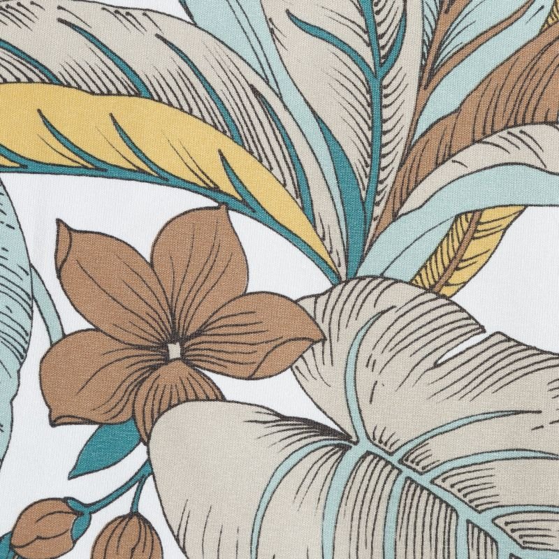 Białe tło w połączeniu ze wzorem w odcieniach turkusu, beżu, brązu oraz koloru musztardowego |